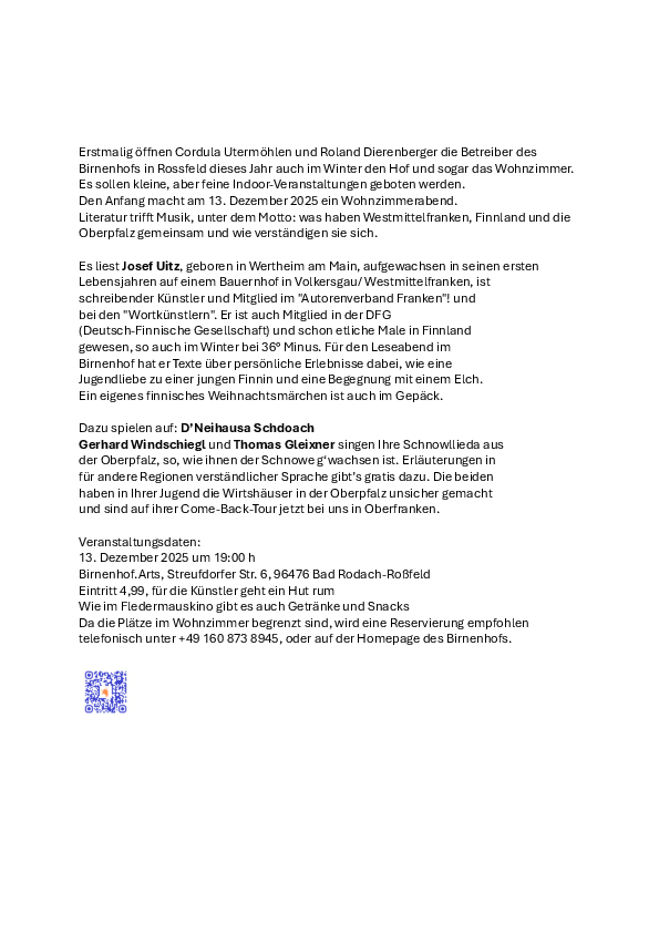 Den Anfang macht am 13. Dezember 2025 ein Wohnzimmerabend. Literatur trifft Musik, unter dem Motto: was haben Westmittelfranken, Finnland und die Oberpfalz gemeinsam und wie verständigen sie sich.